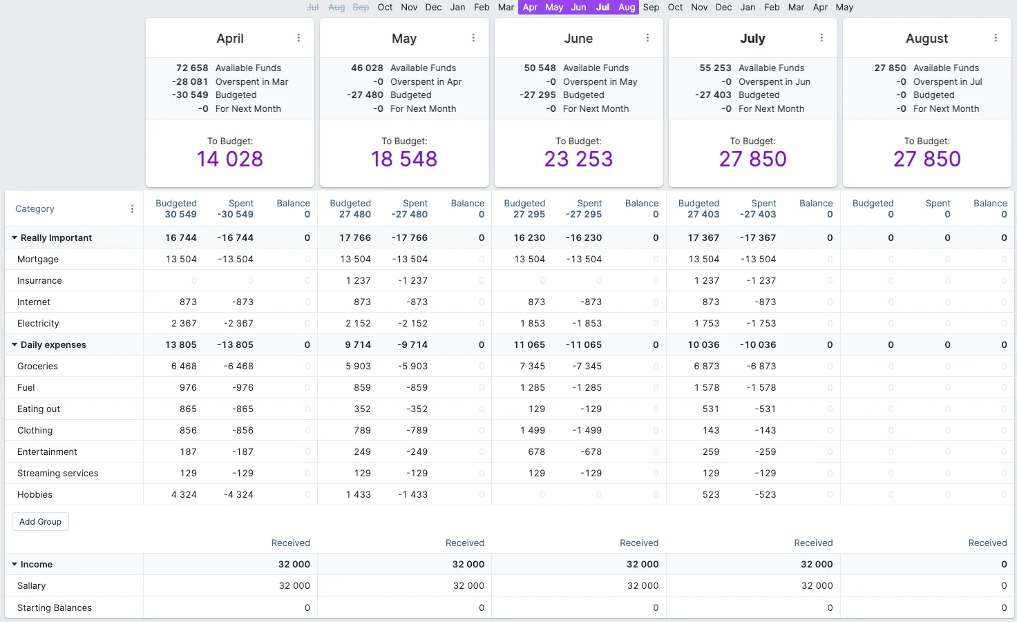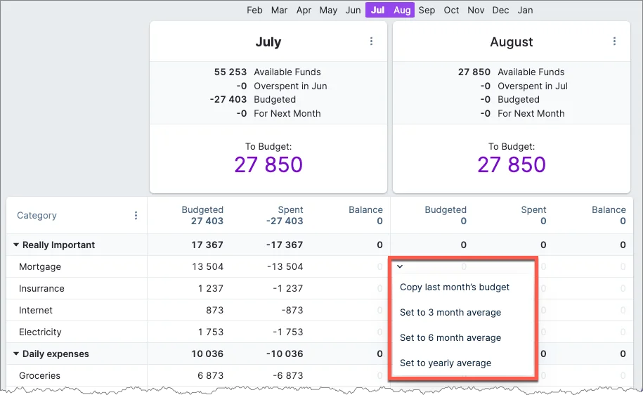 Set aside time to analyze your spending and income at the end of the month. Based on this, you can add values to the upcoming months' Budgeted column.