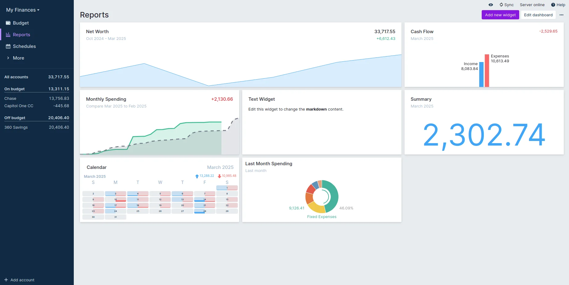 Cash flow shows your spending over time. It only looks at budgeted accounts and shows their balance over time, and includes separate income and expense visualizations. It's a quick way to see how your income and expenses affected your available money over time. Your budgeted accounts are considered to be "cash on hand," so this gives you a picture of how available money fluctuates.