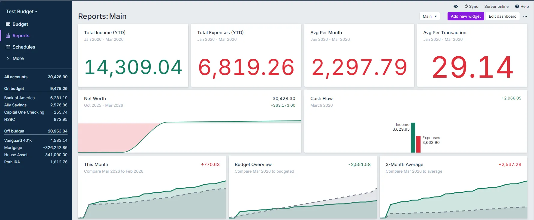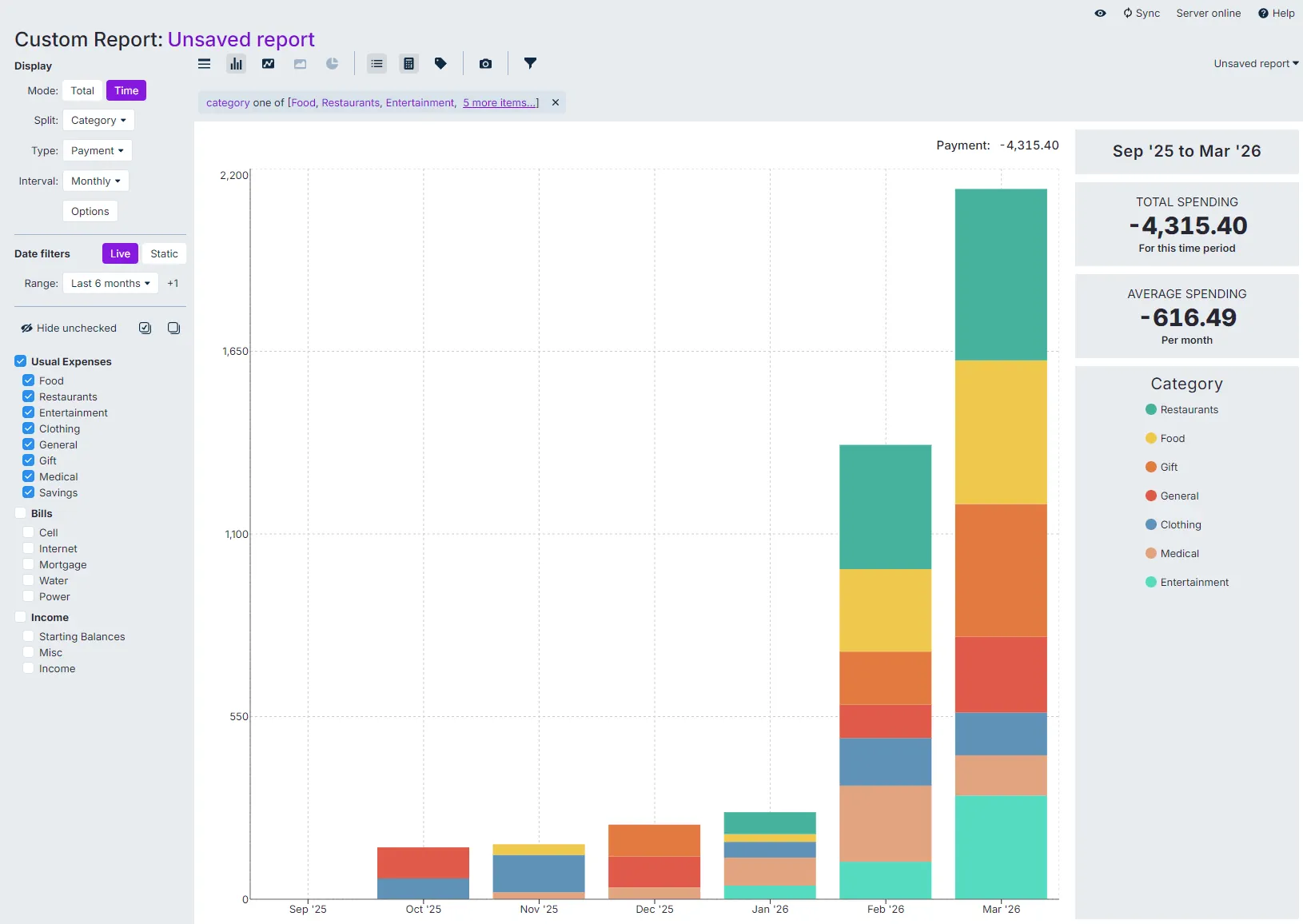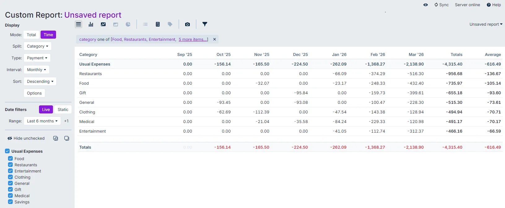 Actual's custom reports will allow you to create reports giving in-depth analyses on your spending habits and your income. You can find them thoroughly covered in Custom Reports.